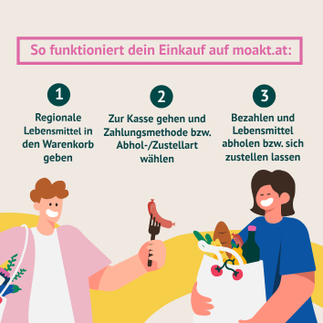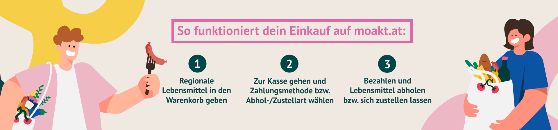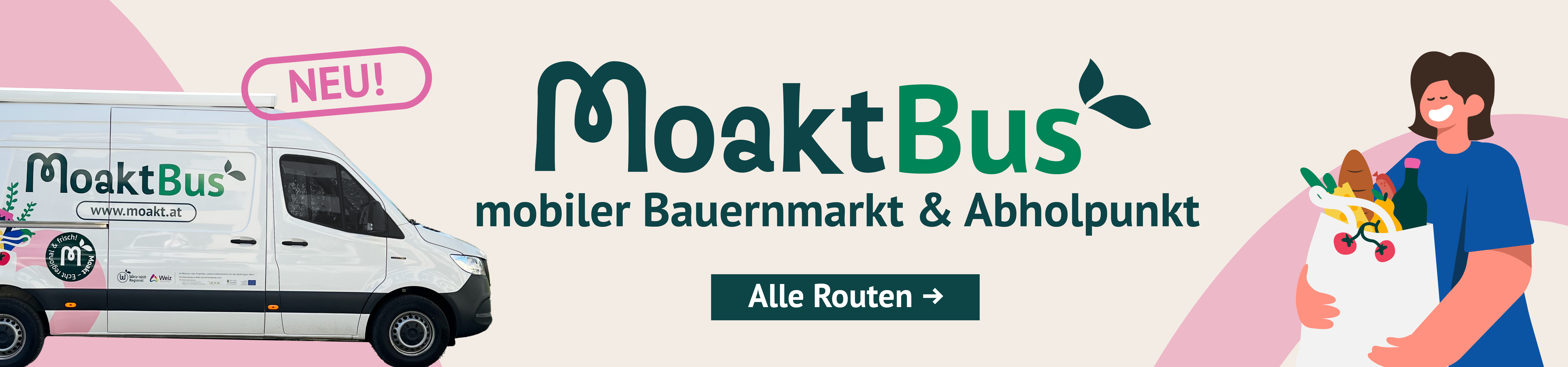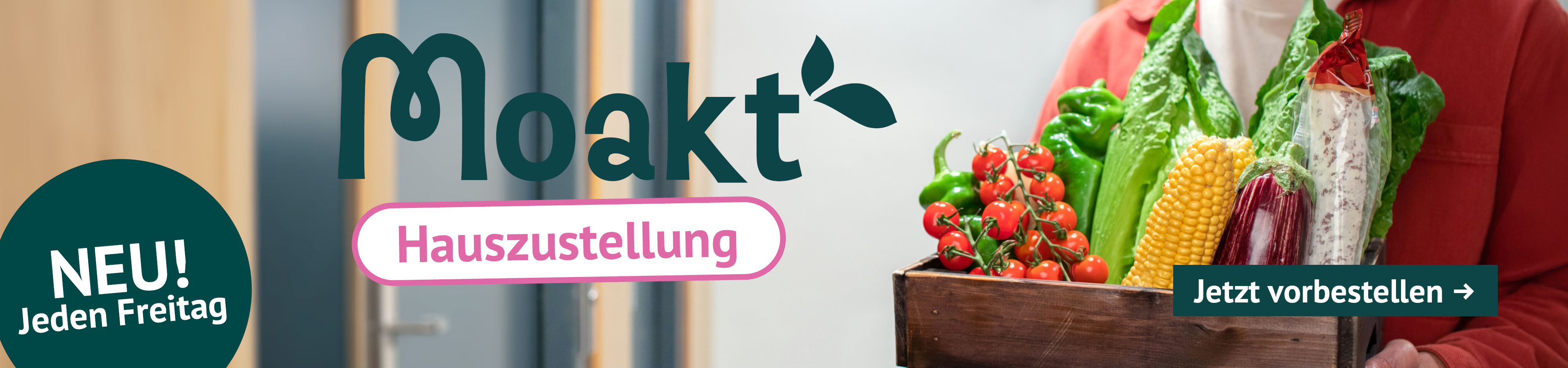 Bei uns kannst du rund 700 regionale Produkte von unseren 50 MoaktBetrieben online bestellen und abholen oder per Hauszustellung im Raum Weiz vor die eigene Haustür liefern lassen. Gerne kannst du auch direkt in unserem MoaktLaden (Florianigasse 5, 8160 Weiz, täglich von 5 - 23 Uhr geöffnet) bzw. bei unserem MoaktBus (bei Veranstaltungen unterwegs) einkaufen. Wir freuen uns, wenn du mit deinem Einkauf beim Moakt unsere regionalen Landwirt:innen und Organisationen stärkst! 😊